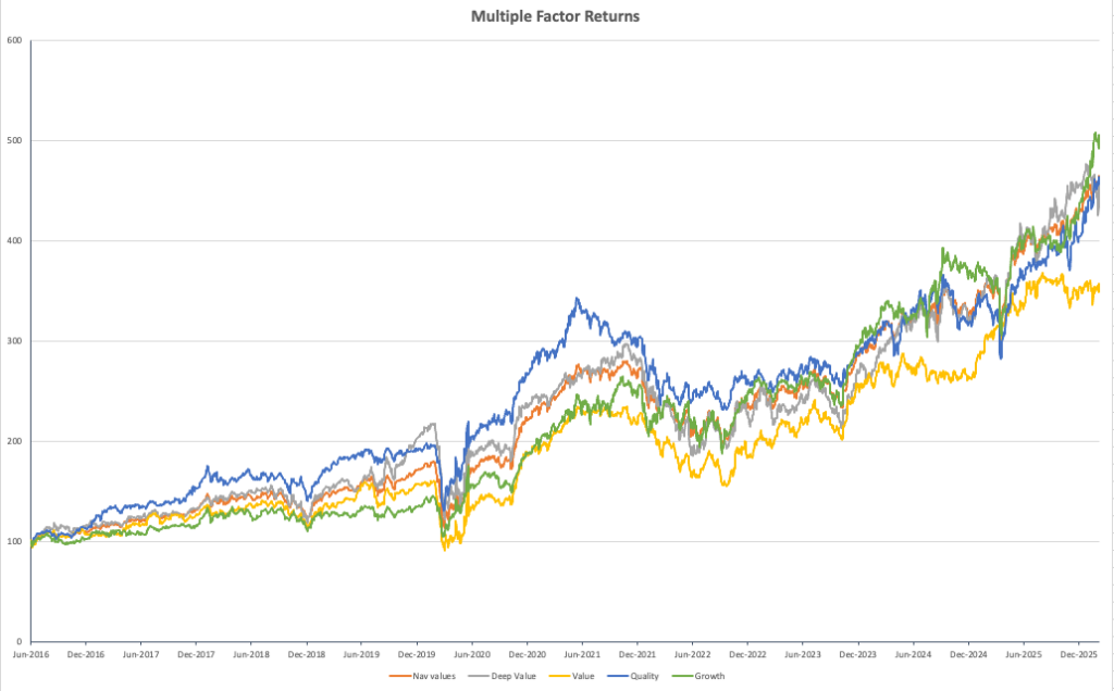 This is reinforced by observing the longer-term compounding portfolio and sub portfolio NAV chart shown in Chart 1. Quality – the dominant (blue line) from 2016 onwards remains aligned with both the total portfolio (orange) and clearly ahead of value (yellow) over the total period with Growth a clear compounding winner over longer horizons and, the dominating factors of late. Meanwhile, the sharp drop off in relative performance of Value is thrown into sharp relief in the chart, suggesting that broader risk appetites have already been muted in recent times.