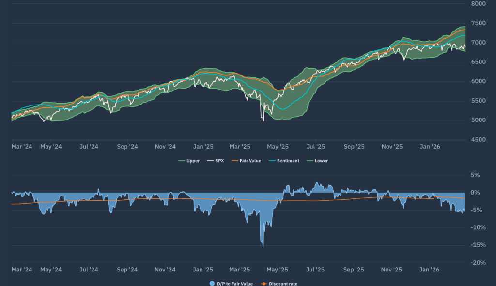 If we take a look at the Apollo market chart for the (market Cap weighted) S&P500 shown in chart 2 we see a market that, despite improving growth expectations (a steepening of the orange fair value line) and sentiment (the blue line) has sunk to the bottom of the FV range. The width of the FV range started to widen once again and it appears that even before the events of the weekend, US markets were “not buying it” .
