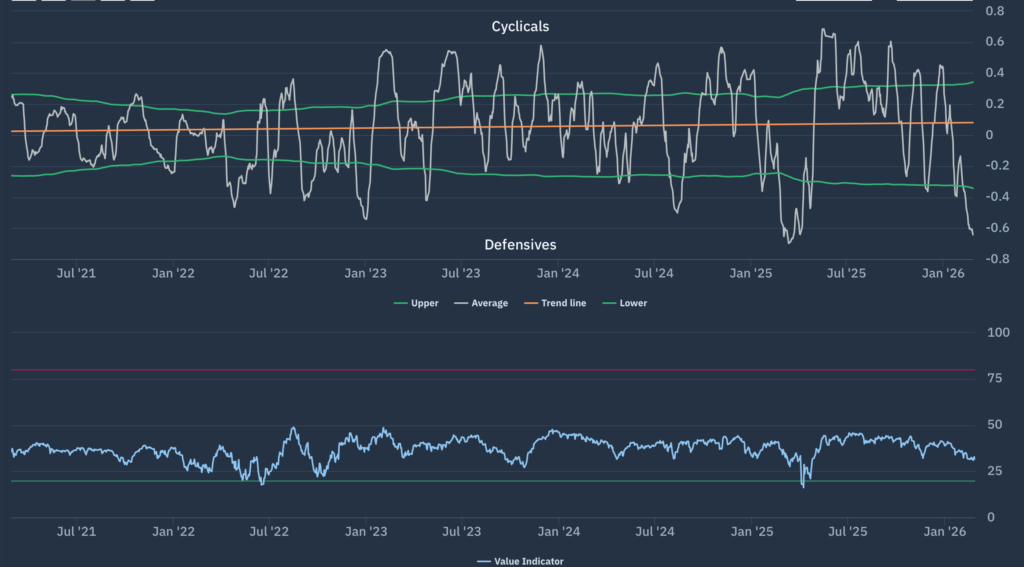 We can observe the unequivocally negative performances across the higher beta cyclicals versus a universally positive swing towards defensives. This is unlikely to be a coincidence. It is in stark contrast to the broadly “net beta neutral” calendar year start that we noted last month following a strong start to the year. We can illustrate this as a “Macro indicator” via our Net beta chart (Chart 4) which we can define as the net exposure bias between defensives and cyclicals. For reference, as of last Friday we are already back at the 5-year lows experienced in April 2025.