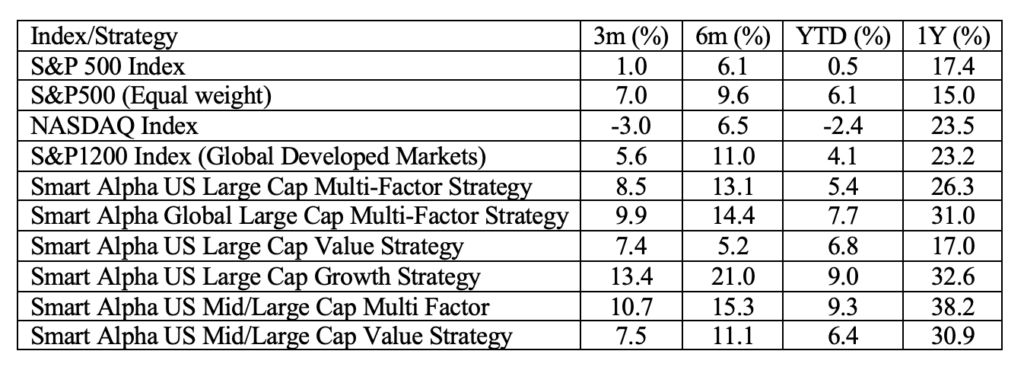 In terms of the sector drivers that we can see in Table 2, the differentiated drivers of the Global Multi–factor portfolio from the sub-portfolios YTD has been from Quality (+13.4%) and Growth (+14.6%). This is an important divergence in the current market situation as risks to both Factor categories are likely to be both pronounced and defensive in nature as de-risking from the recent equity winners and from potential casualties in relation to increase uncertainty about more intangible future growth. We could see these as not only areas for profit taking (and clearly there aren’t a huge amount of those to be taken right now) but also de-risking at the portfolio level.